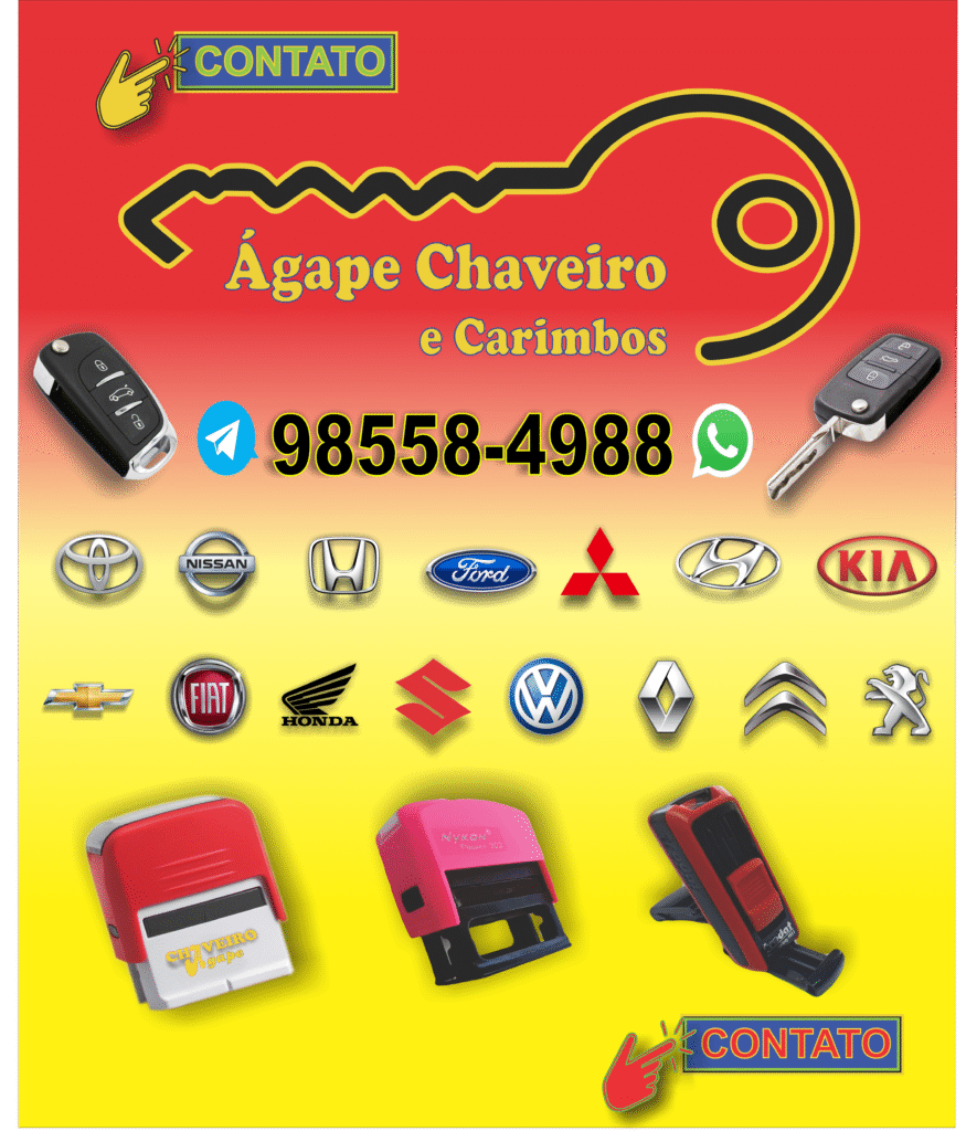 Ágape Chaveiro e Carimbos, sejam bem vindos! CHAVES AUTOMOTIVAS Faço o upgrade da sua chave! cópia ou todas perdidas! confecção de carimbos! Aberturas de resiencias. Abertura de veículos. Cópia de chaves Multi-Ponto. Chaves para veículos.